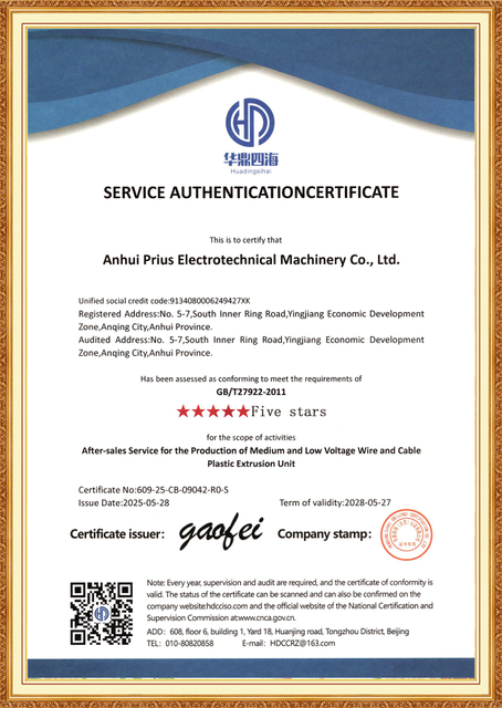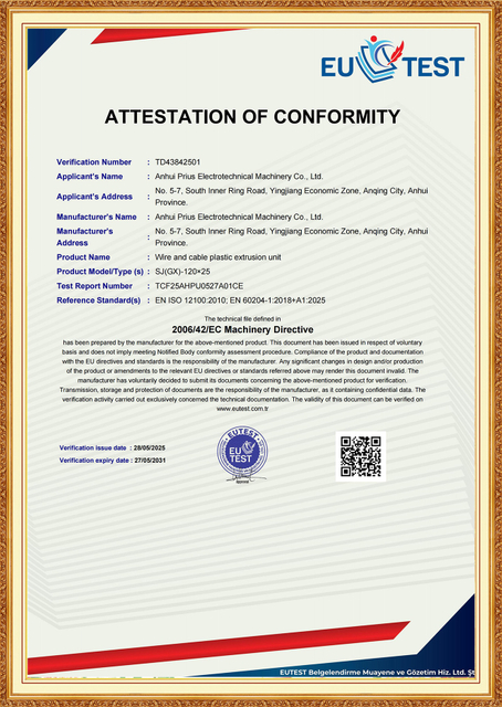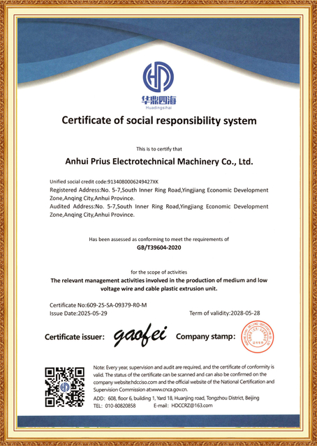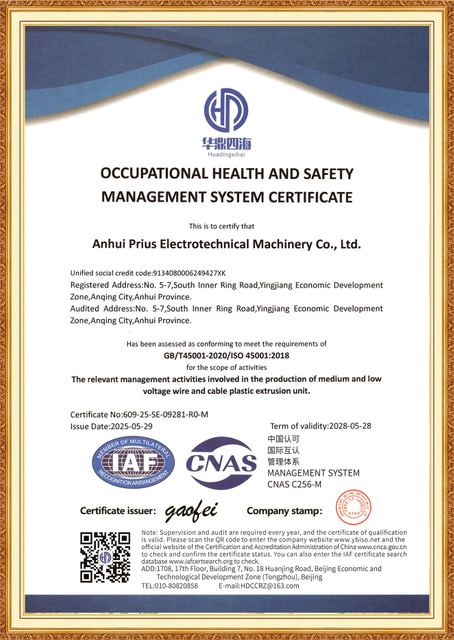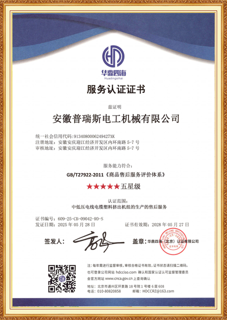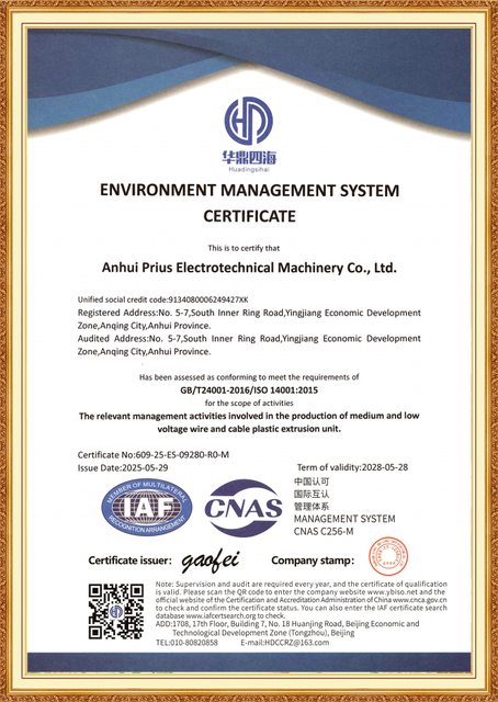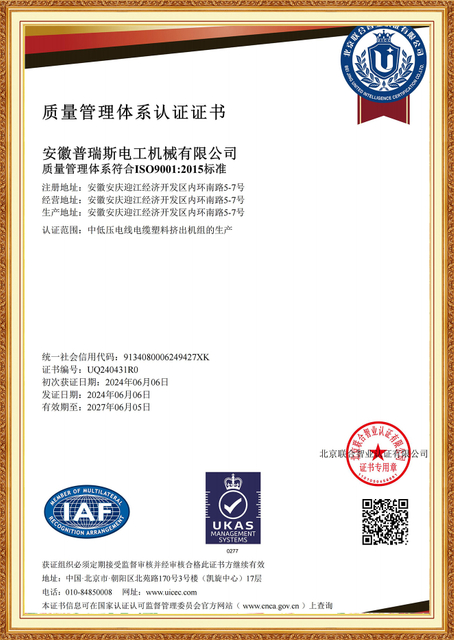安徽普瑞斯电工机械有限公司(注册资金8000万元,占地面积60000㎡)是国家级高新技术企业,专注于中低压、特种电缆及光缆挤出设备的研发、生产与销售。公司拥有“省级企业研发中心”,并荣获“安徽省质量奖”“全省就业先进集体”等荣誉,同时通过ISO9001质量管理体系、ISO14001环境管理体系、ISO45001职业健康安全管理体系、售后服务体系及欧盟CE认证。